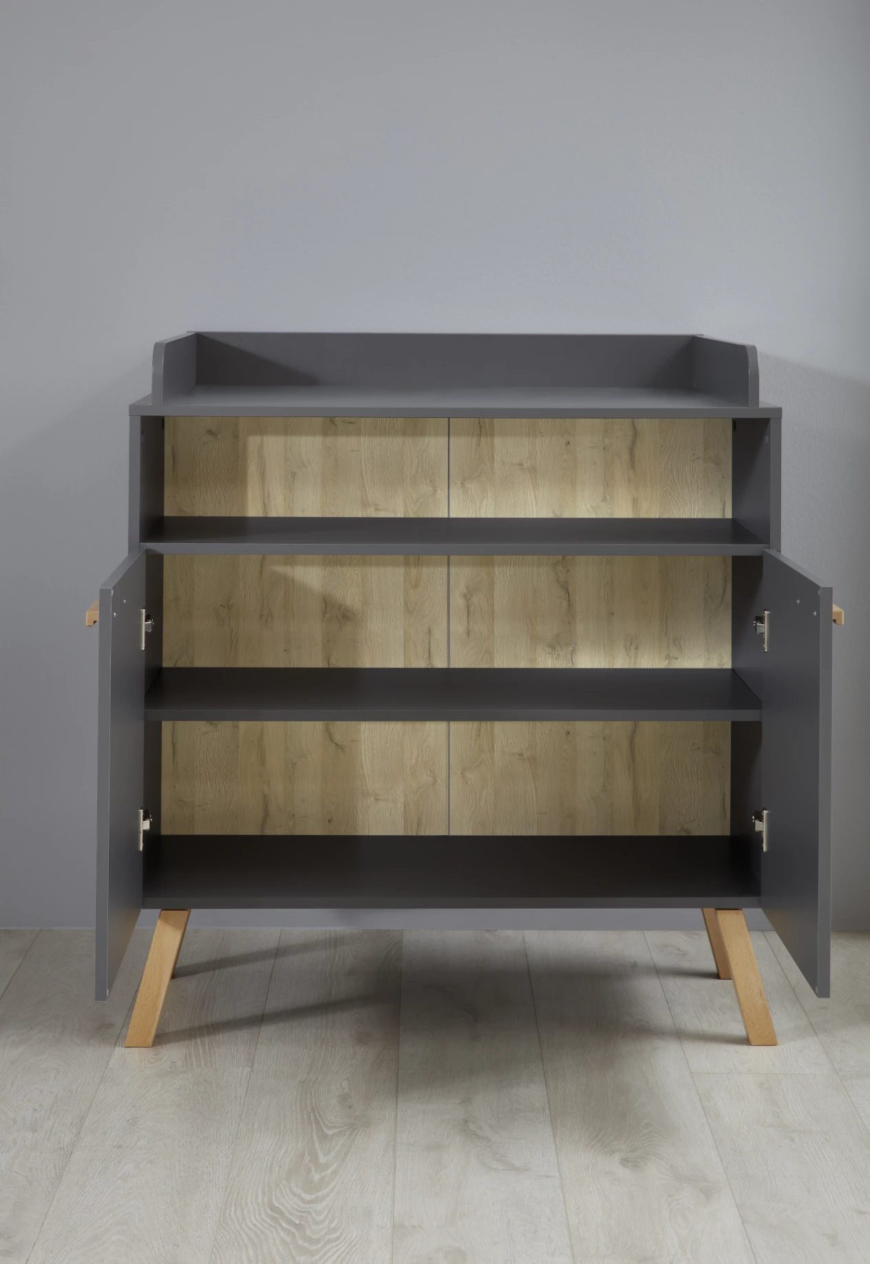 Moderne, onderhoudsvriendelijke verschoonunit met duurzaam melamine-oppervlak. Voorzien van twee deuren, een open vak, een plank en een groot verschoonoppervlak. Grijs karkas en honingkleurige handgrepen. Afmetingen 96 x 78 x 105 cm. FSC-gecertificeerd en voldoet aan de veiligheidseisen. Biedt veelzijdige combinatiemogelijkheden met bestaande meubels. Levering inclusief meubilair, montagehandleiding en materiaal. Gemakkelijk verpakt in meerdere dozen.
