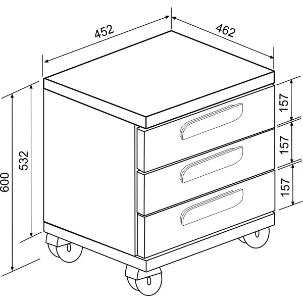 Nachtkastje Bo0 met wieltjes, 3 lades en langwerpige handgreep. Gemaakt uit spaanplaat en afgewerkt met hoogwaardige melaminelaag. Combineerbaar met de bedden uit de Bo9- en Bo12-collectie en andere producten uit de Bo0-collectie.