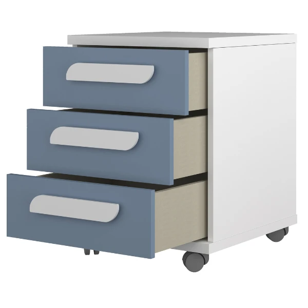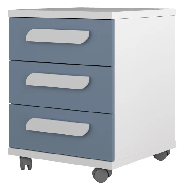 Nachtkastje Bo0 Met Wieltjes, 3 Lades En Langwerpige Handgreep – Wit/ Blauw