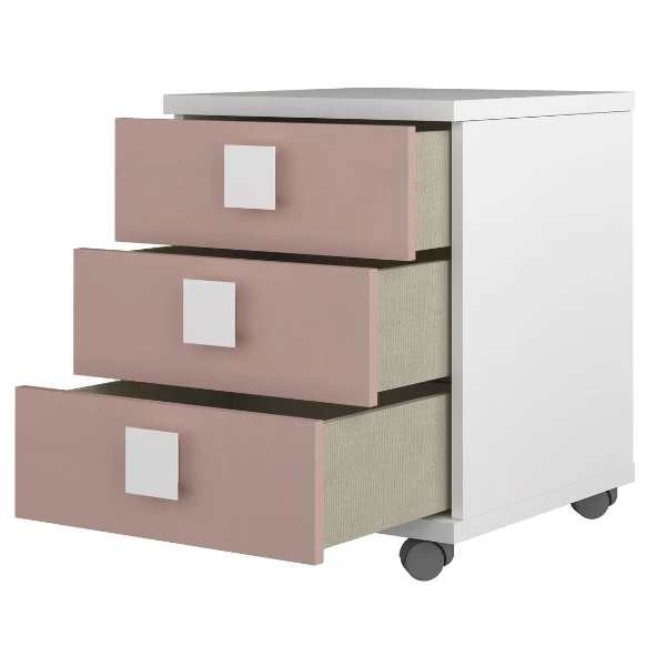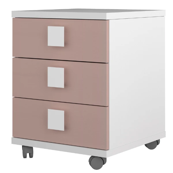 Nachtkastje Bo0 Met Wieltjes, 3 Lades En Vierkante Handgreep – Wit/ Oudroze