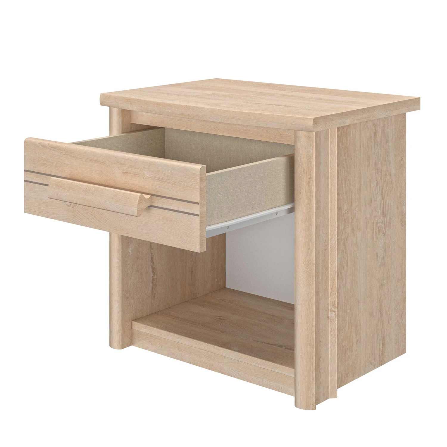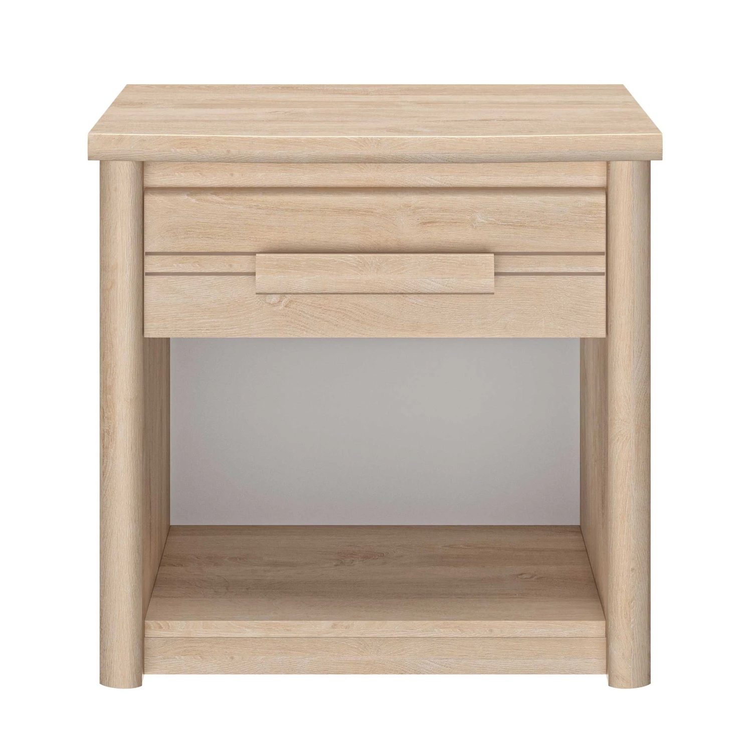 Nachtkastje Morris met lade, gemaakt van spaanplaat met imitatieprint van blonde eik.