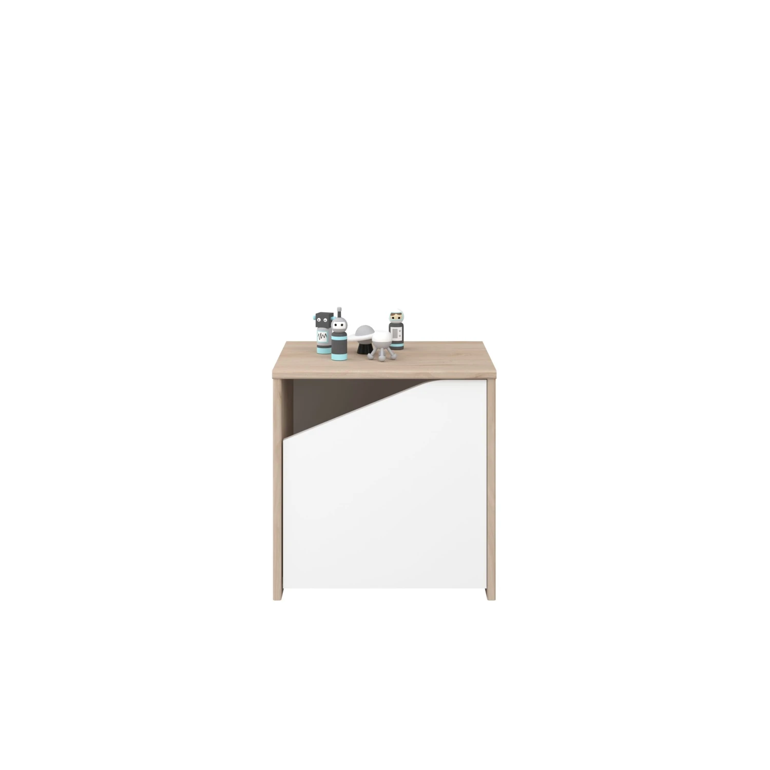 Nachtkastje Shelby, gemaakt uit spaanplaat in een decor van Jackson eik en een witte draaideur.ย