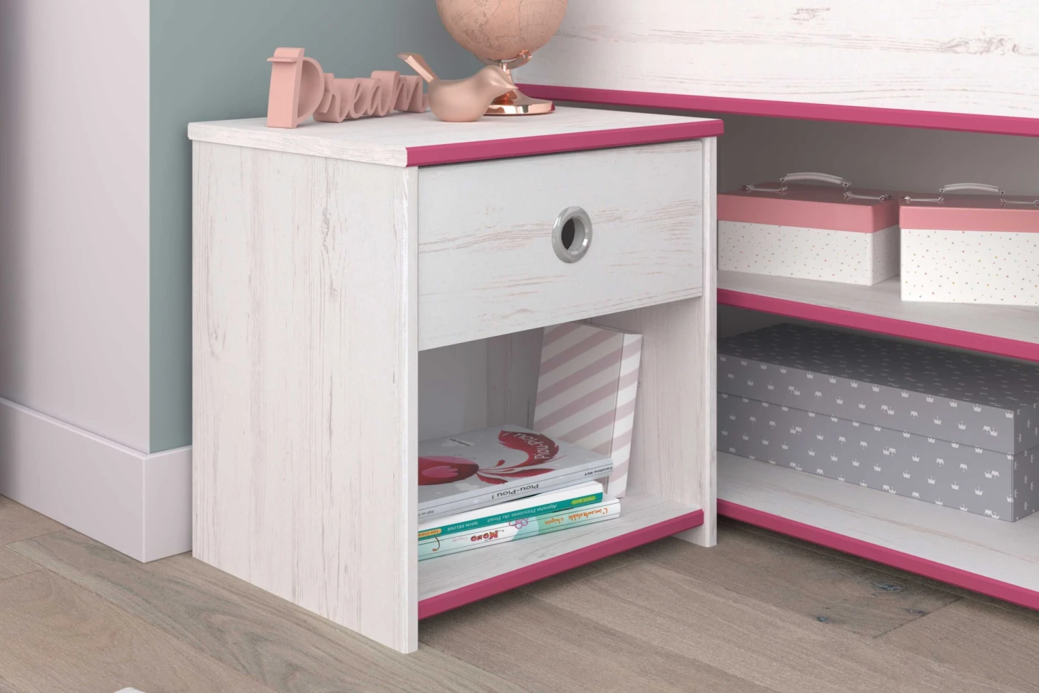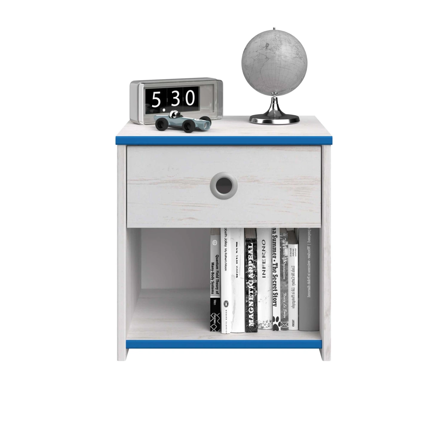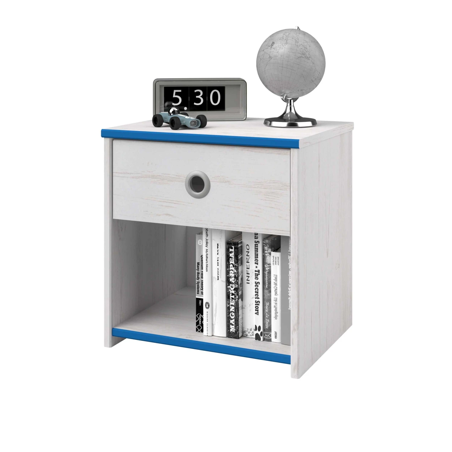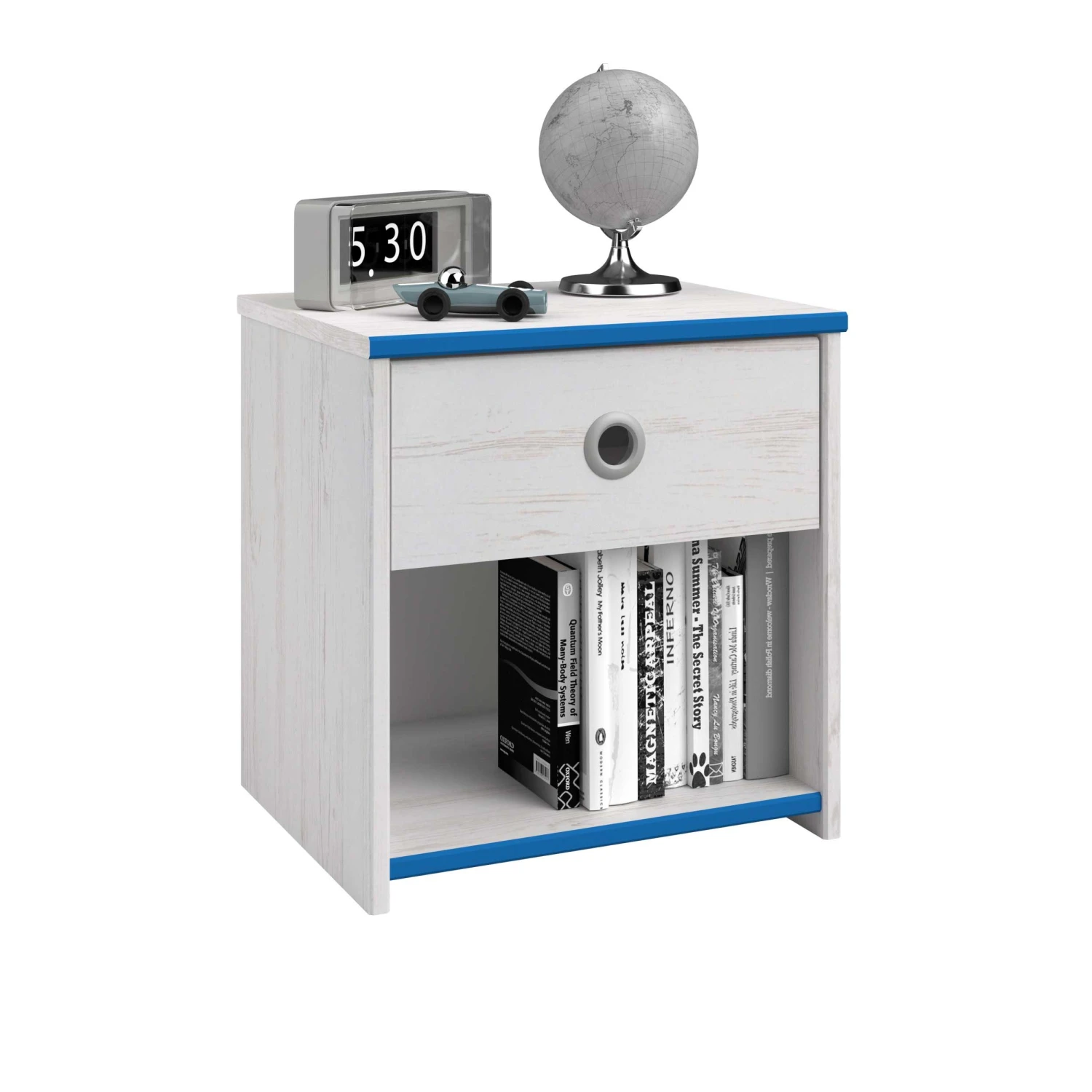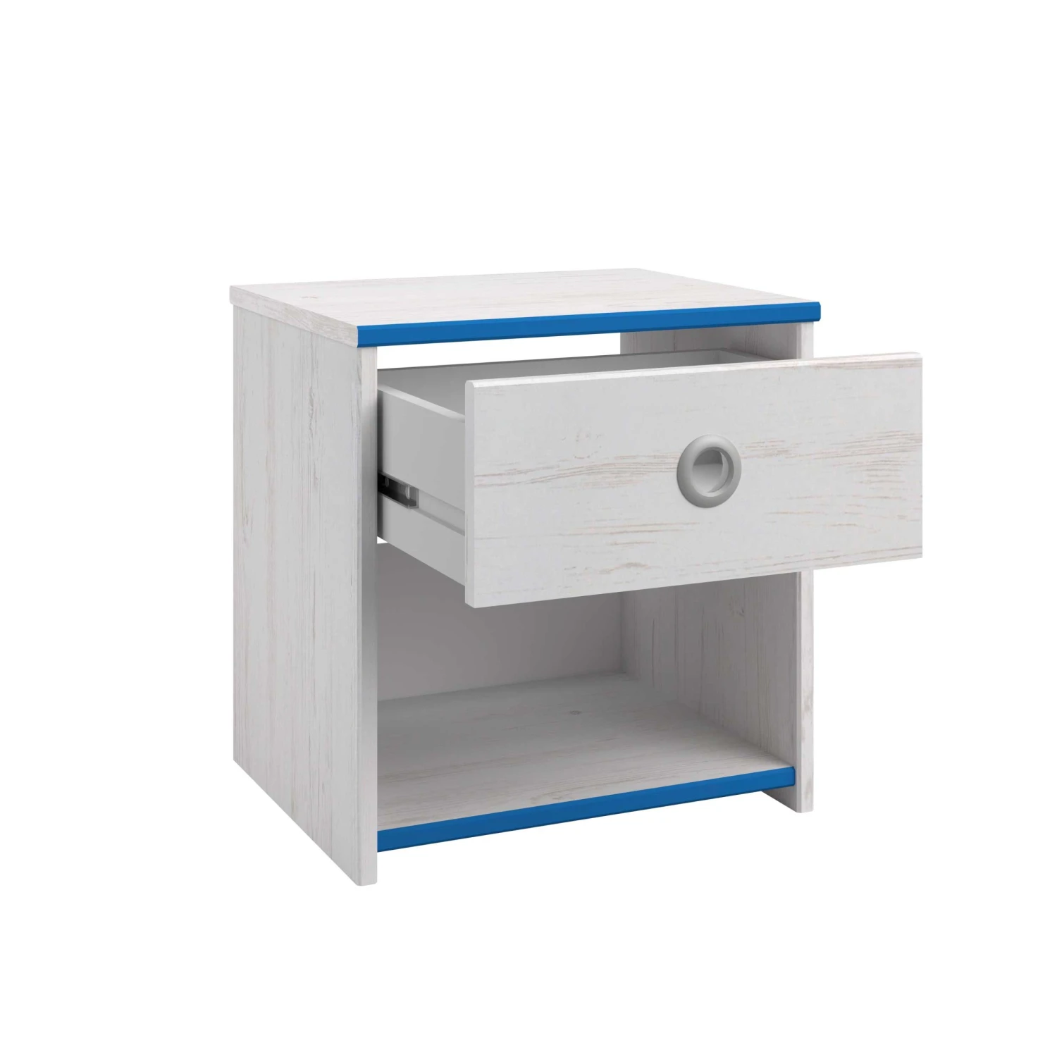 Plaats dit leuke nachtkastje naast het Smoozy kajuitbed! Het nachtkastje heeft een lade met een origineel rond handvat in grijs aluminium. Het kastje beschikt ook over een opbergvak voor bijvoorbeeld een leesboek.ย ย