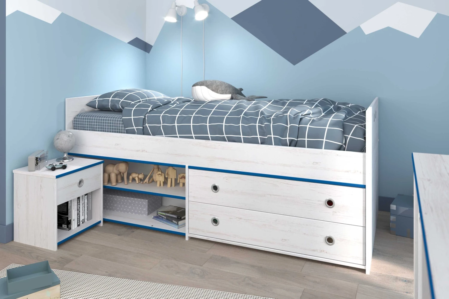 De Smoozy kinderkamer omvat meubelen uit spaanplaat met een wit dendecor. Dankzij de verwisselbare randen van de meubelen kan deze slaapkamer in een-twee-drie tot een jongens- of meisjeskamer omgetoverd worden. De ene kant is namelijk blauw, de andere kant is roze. Je kan tijdens de installatie zelf kiezen welke kleur je wenst te zien.ย