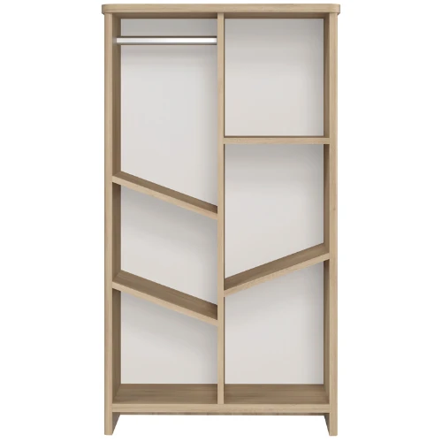 Opbergkast Binno met 4 legplanken en 1 kledingroede. Gemaakt uit spaanplaat met eikdecor en in het wit.
