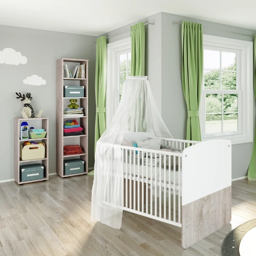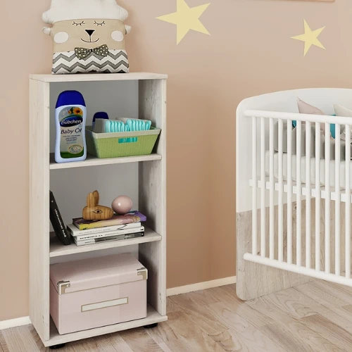 Deze eenvoudige opbergkast in zacht eikdecor bestaat uit 3 open vakken waarin u kinderboekjes, speelgoed en verzorgingsproducten van uw kindje kunt opbergen. Dit kastje maakt deel uit van de Halula babykamer maar kan ook gemakkelijk gebruikt worden in elke andere babykamer dankzij zijn neutrale ontwerp. Bekijk ook onze andere meubelen van de Halula babykamer. Schroeven en pluggen voor wandmontage niet inbegrepen.