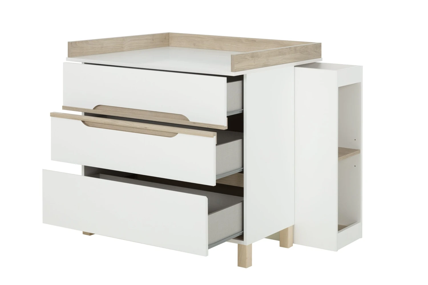 Dit kastje past perfect bij de commode van de Mia-collectie, in combinatie met de verzorgingstafel. Zo kan je hygiëneproducten en luiers binnen handbereik van de verzorgingstafel houden. De kast beschikt over twee open vakken, van elkaar gescheiden door een legplank in kastanjedecor. Aan de bovenkant is er extra opbergplaats voorzien door de verhoogde randen.