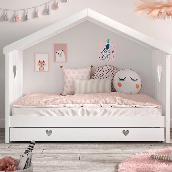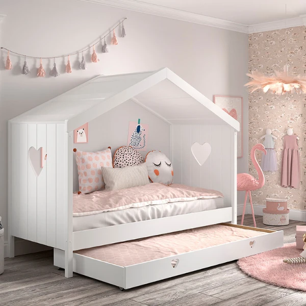 Door de romantische details zal bedhuisje Amori gegarandeerd het hart van jouw kleine meid stelen. We durven er zelfs om te wedden dat jij met de aankoop van dit bed een speciaal plekje in haar hart zult krijgen. Het is overduidelijk dat de liefde als inspiratiebron voor dit bedhuisje diende. Zo is er in het hoofdbord en het voeteinde telkens een hart uitgesneden en kan de bedlade door de twee uitgesneden hartjes makkelijk van onder het bed geschoven worden. Het bedhuisje is geschikt voor een matras van 90×200 cm en de bedlade voor een matras van 90×190 cm. De bedlade is voorzien van wieltjes en kan ook als opbergruimte gebruikt worden. Dit huisje is gemaakt uit massief grenenhout en MDF.