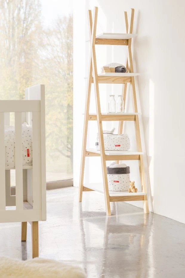 Dit leuke rek vervolledigt de inrichting van de kinderkamer en zorgt voor heel wat extra opbergruimte. De 5 legplanken zijn gemaakt van wit gelakte MDF. Het frame is gemaakt van massief hout.