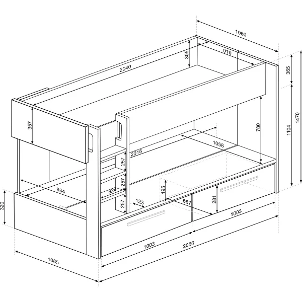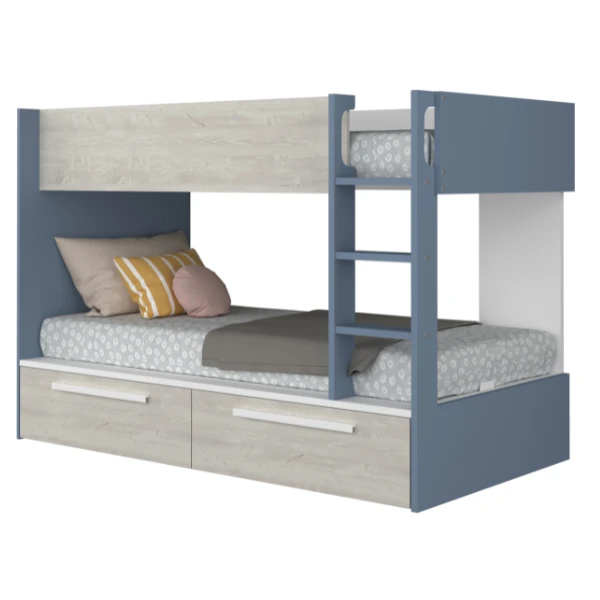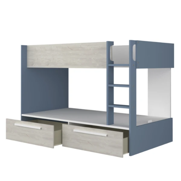 Stapelbed Fleur geeft je de mogelijkheid de ruimte in jouw logeerkamer of gedeelde kinderkamer optimaal te benutten. Door deย blauwe accentenย straalt het geheel rust en stabiliteit uit. Het stapelbed biedt plaats voorย 2 matrassen van 90×200 cm. Deze matrassen zijnย niet inbegrepenย en kunnen aangekocht worden op onze website. Het bed beschikt overย twee bedladesย waarin je heel wat spullen (speelgoed, beddengoed, knuffels etc.) kunt opbergen. Om ongelukken te vermijden is het laddertje bovendien voorzien vanย gebogen handgrepenย enย anti-slipstroken. Daarnaast beschikt het bed over eenย hoge uitvalbeveiliging. Je kan je (klein)kinderen dus met een gerust hart laten slapen. Stapelbed Fleur is gemaakt vanย spaanplaatย en werd afgewerkt inย hoogwaardig melamine.ย