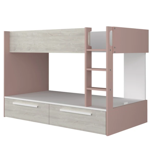Stapelbed Fleur geeft je de mogelijkheid de ruimte in jouw logeerkamer of gedeelde kinderkamer optimaal te benutten. Door deย oudrozeย accenten in het stapelbed krijgt de kamer een lieflijke uitstaling. Het stapelbed biedt plaats voorย 2 matrassen van 90×200 cm. Deze matrassen zijnย niet inbegrepenย en kunnen aangekocht worden op onze website. Het bed beschikt overย twee bedladesย waarin u heel wat spullen (speelgoed, beddengoed, knuffels etc.) kunt opbergen. Om ongelukken te vermijden is het laddertje bovendien voorzien vanย gebogen handgrepenย enย anti-slipstroken. Daarnaast beschikt het bed over eenย hoge uitvalbeveiliging. U kan uw (klein)kinderen dus met een gerust hart laten slapen. Stapelbed Fleur is gemaakt vanย spaanplaatย en werd afgewerkt inย hoogwaardig melamine.ย