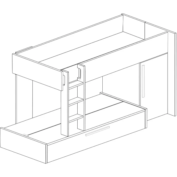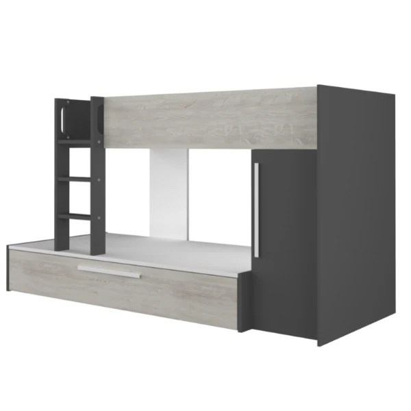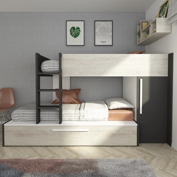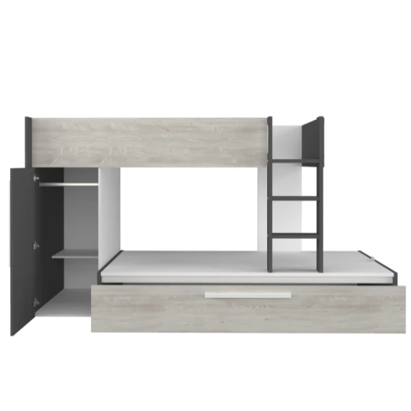Stapelbed Fleur geeft je de mogelijkheid de ruimte in jouw logeerkamer of gedeelde kinderkamer optimaal te benutten. Door zijn neutrale kleur past het bed in zowel een jongens- als meisjeskamer en trekt het niet te veel de aandacht.ย Het stapelbed biedt plaats voorย 2 matrassen van 90×200 cm. In een uitschuifbare bedlade is er ook nog plaats voor een matras vanย 90×190 cm. Deze matrassen zijnย niet inbegrepenย en kunnen aangekocht worden op onze website. Het bed beschikt over een kledingkast met kledingroede en legplank. Stapelbed Fleur is gemaakt vanย spaanplaatย en werd afgewerkt inย hoogwaardig melamine. Om ongelukken te vermijden is het laddertje voorzien van gebogen handgrepen en anti-slipstroken.ย