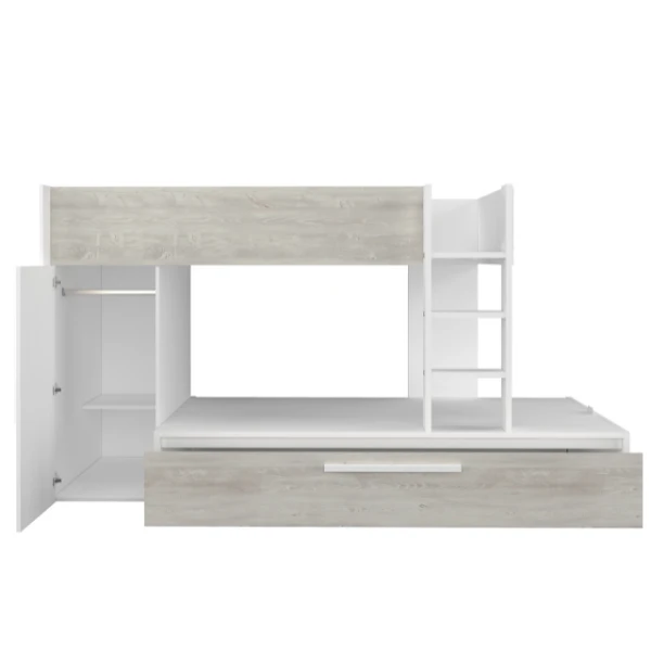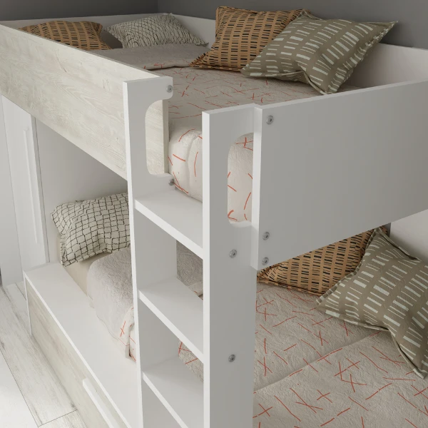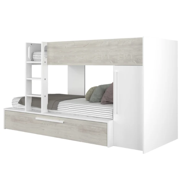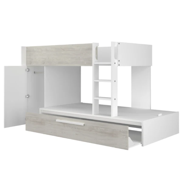 Stapelbed Fleur geeft je de mogelijkheid de ruimte in jouw logeerkamer of gedeelde kinderkamer optimaal te benutten. Door zijnย neutrale kleur past ditย stapelbed in elke kamer, hoe sober of kleurrijk deze ook is aangekleed. Het stapelbed biedt plaats voorย 2 matrassen van 90×200 cm. In een uitschuifbare bedlade is er ook nog plaats voor een matras vanย 90×190 cm. Deze matrassen zijnย niet inbegrepenย en kunnen aangekocht worden op onze website. Het bed beschikt over een kledingkast met kledingroede en legplank. Stapelbed Fleur is gemaakt vanย spaanplaatย en werd afgewerkt inย hoogwaardig melamine. Om ongelukken te vermijden is het laddertje voorzien van gebogen handgrepen en anti-slipstroken.ย