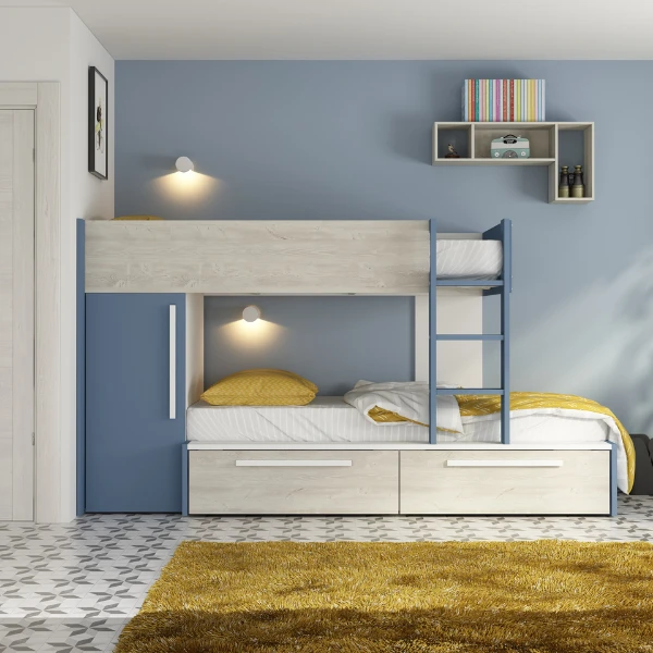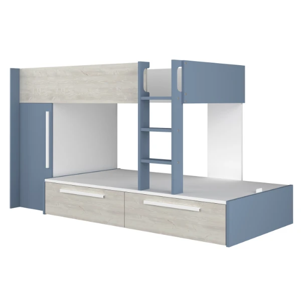 Stapelbed Fleur geeft je de mogelijkheid de ruimte in jouw logeerkamer of gedeelde kinderkamer optimaal te benutten. Door de blauwe accenten straalt het geheel rust en stabiliteit uit. Het stapelbed biedt plaats voor 2 matrassen van 90×200 cm. Deze matrassen zijn niet inbegrepen en kunnen aangekocht worden op onze website. Het bed beschikt over twee lades en een kledingkast met kledingroede. Stapelbed Fleur is gemaakt van spaanplaat en werd afgewerkt in hoogwaardig melamine. Om ongelukken te vermijden is het laddertje voorzien van gebogen handgrepen en anti-slipstroken.