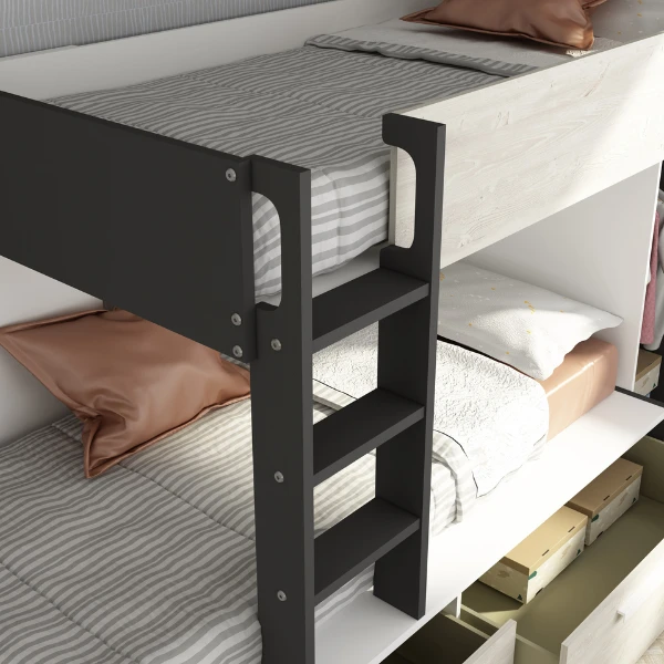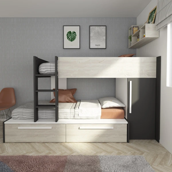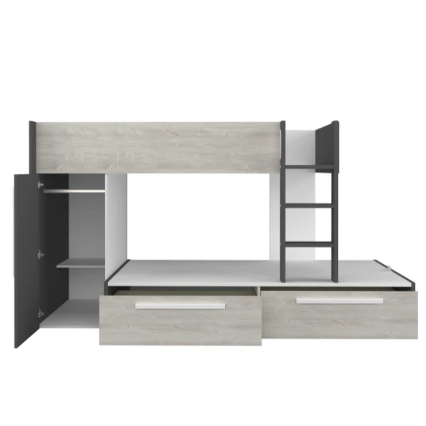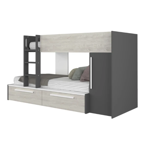 Stapelbed Fleur geeft je de mogelijkheid de ruimte in jouw logeerkamer of gedeelde kinderkamer optimaal te benutten. Door zijn neutrale kleur past het bed in zowel een jongens- als meisjeskamer en trekt het niet te veel de aandacht. Het stapelbed biedt plaats voorย 2 matrassen van 90×200 cm. Deze matrassen zijnย niet inbegrepenย en kunnen aangekocht worden op onze website. Het bed beschikt over twee lades en een kledingkast met kledingroede. Stapelbed Fleur is gemaakt vanย spaanplaatย en werd afgewerkt inย hoogwaardig melamine. Om ongelukken te vermijden is het laddertje voorzien van gebogen handgrepen en anti-slipstroken.ย