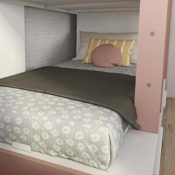 Stapelbed Fleur geeft je de mogelijkheid de ruimte in jouw logeerkamer of gedeelde kinderkamer optimaal te benutten. Door de oudroze accenten in het stapelbed krijgt de kamer een lieflijke uitstaling. Het stapelbed biedt plaats voor 2 matrassen van 90×200 cm. Deze matrassen zijn niet inbegrepen en kunnen aangekocht worden op onze website. Het bed beschikt over twee lades en een kledingkast met kledingroede. Stapelbed Fleur is gemaakt van spaanplaat en werd afgewerkt in hoogwaardig melamine. Om ongelukken te vermijden is het laddertje voorzien van gebogen handgrepen en anti-slipstroken.ย