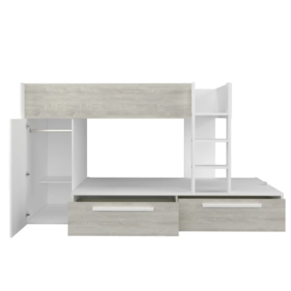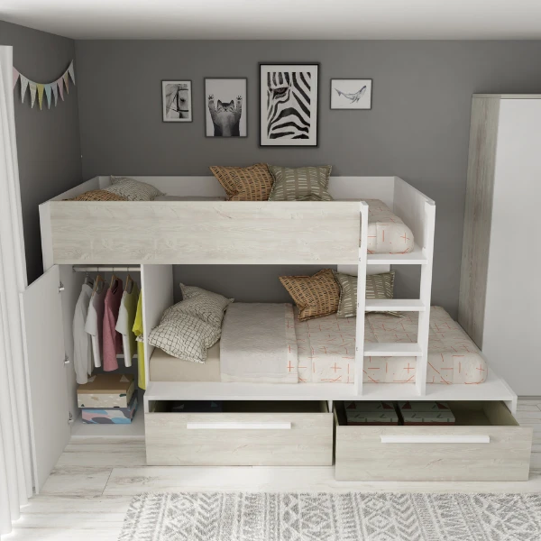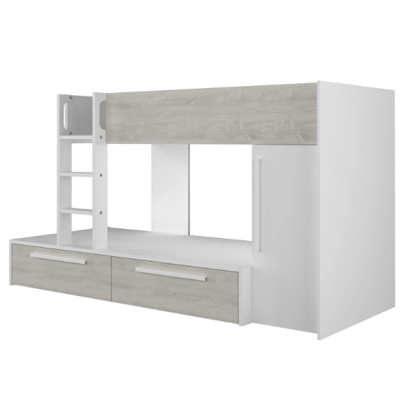 Stapelbed Fleur geeft je de mogelijkheid de ruimte in jouw logeerkamer of gedeelde kinderkamer optimaal te benutten. Door zijnย neutrale kleurย past ditย stapelbed in elke kamer, hoe sober of kleurrijk deze ook is aangekleed.ย Het stapelbed biedt plaats voorย 2 matrassen van 90×200 cm. Deze matrassen zijnย niet inbegrepenย en kunnen aangekocht worden op onze website. Het bed beschikt over twee lades en een kledingkast met kledingroede. Stapelbed Fleur is gemaakt vanย spaanplaatย en werd afgewerkt inย hoogwaardig melamine. Om ongelukken te vermijden is het laddertje voorzien van gebogen handgrepen en anti-slipstroken.ย
